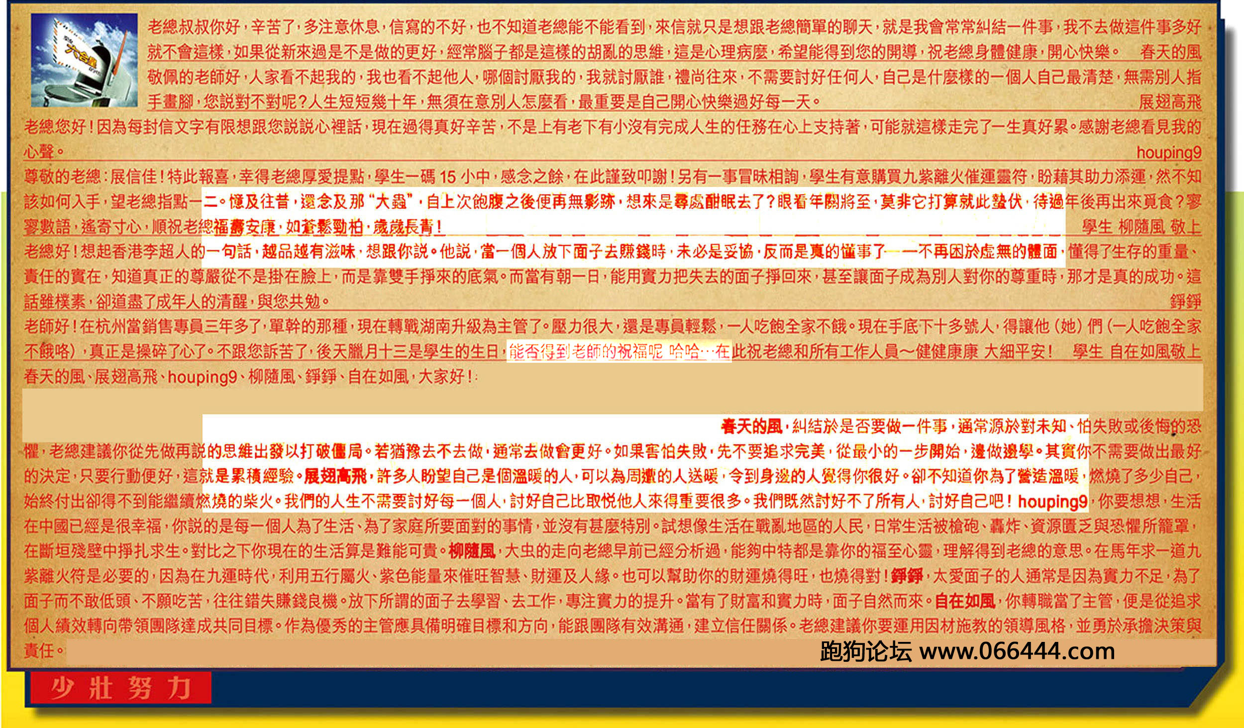 【4】.尊敬的老總:展信佳!特此報喜,幸得老總厚愛提點,學生一碼15小中,感念之餘,在此謹致叩謝!另有一事冒昧相詢,學生有意購買九紫離火催運靈符,盼藉其助力添運,然不知該如何入手,望老總指點一二。憶及往晋,逻念及那“大蟲”自正次飽腹之後便再無影跡,想來是尋處酣眠去了?眼看年關將至,莫非它打算就此蟄伏,待過年後再出來覓食?寥寥數語,遥寄寸心,順祝老總福稱安康,如蒼鬆勁柏,歲歲長青!